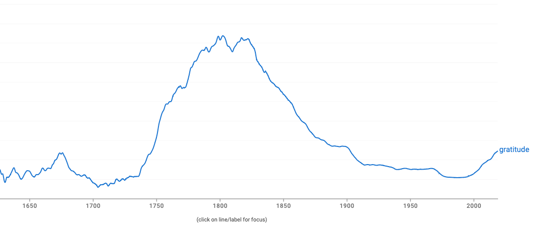 As we've seen with the words Joy and Savour - Gratitude is something of an old-fashioned word. Its use in books peaked in the 1800s before beginning to fall out of vogue.