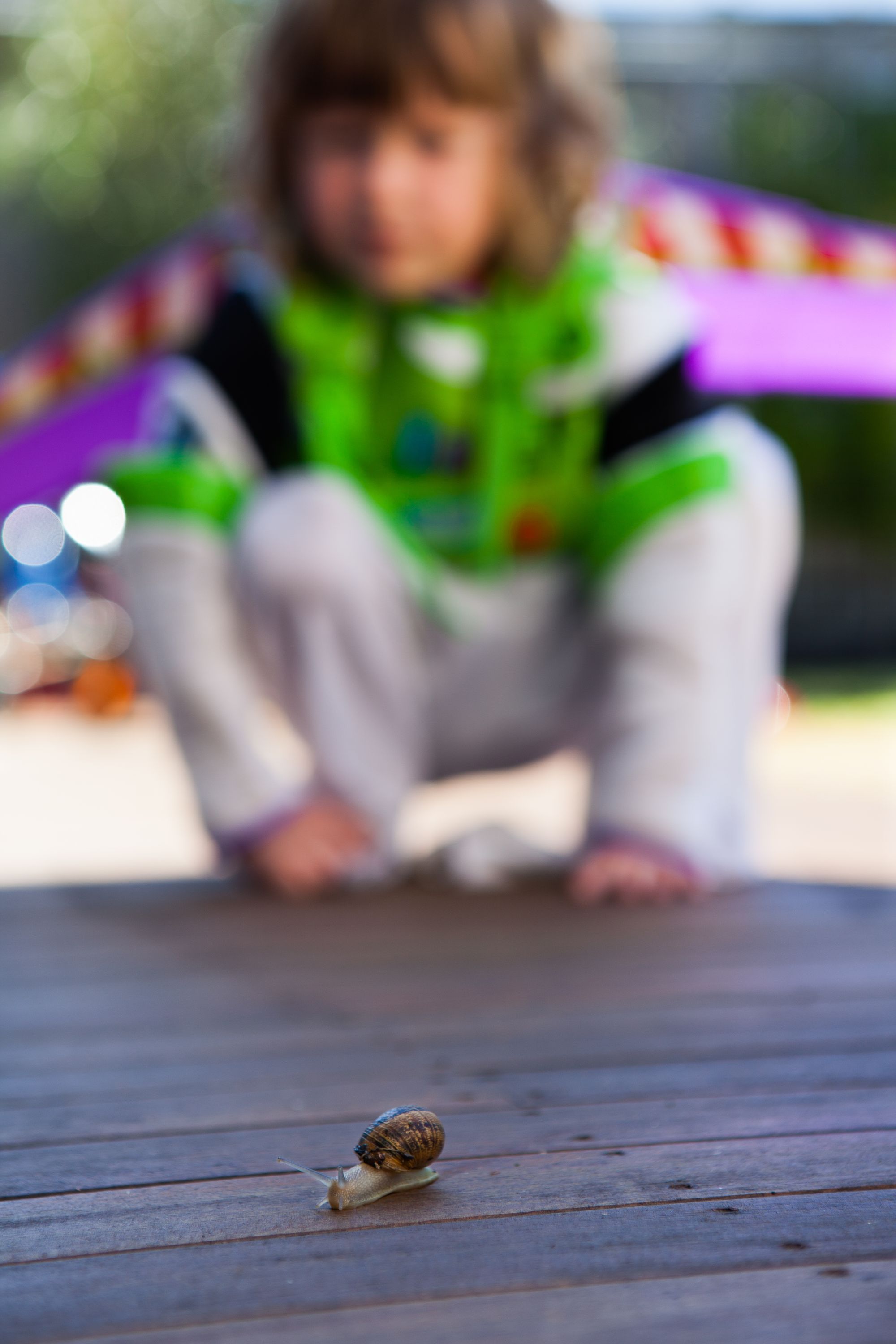 While I shot, my son - who was dressed in his buzz lightyear costume - came to find what I was doing and got curious about the snail.