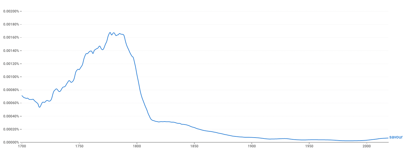 As we found with the 'Joy' prompt - 'Savour' is a rather old-fashioned word that had its heyday back in the 1800s but has fallen out of vogue over the past couple of centuries.